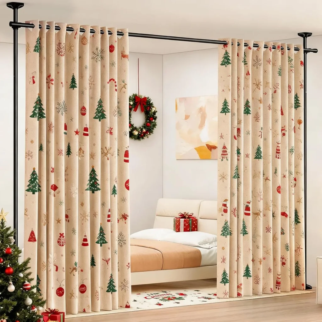 Use ceiling-mounted curtain walls as soft room dividers for living rooms. They are budget-friendly, flexible, and perfect for seasonal decor updates.