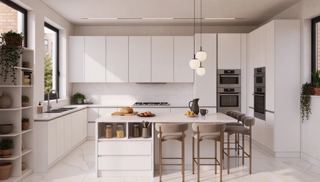 Island-based modular kitchen layouts are perfect for open-plan homes, offering extra workspace, integrated storage, and flexible seating in one central feature. These modern kitchen layouts work best in larger kitchens, where the island becomes both a functional hub and a social focal point. Modular islands can be customized with built-in appliances, wine storage, or additional prep areas, making them excellent space-saving kitchen solutions despite their size. Whether used for cooking, casual dining, or gathering with family and guests, a well-designed kitchen island enhances flow, usability, and everyday comfort